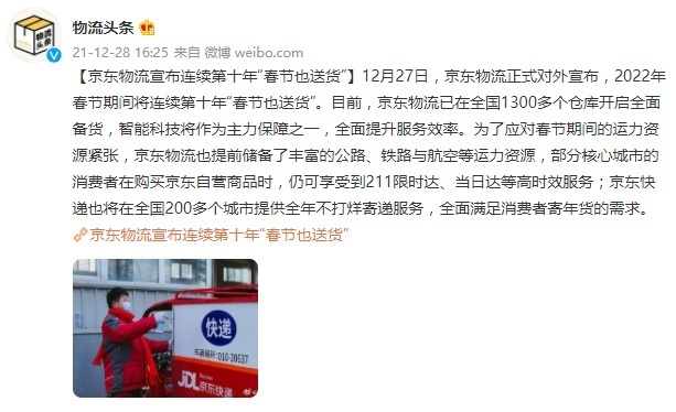 仅仅才过了一天,到了12月27日,京东物流坐不住了,极兔快递坐不住了,申通快递也坐不住了,纷纷发布各自的春节服务公告。三家公司的服务时间,出奇地一致,同样是2022年1月30日,也就是腊月二十八,到2022年2月4日,也就是正月初四。京东物流延续了其一贯的自营优势,极兔通过官方渠道正式确认了不打烊的消息,申通也通过官方渠道正式确认了不打烊的消息。